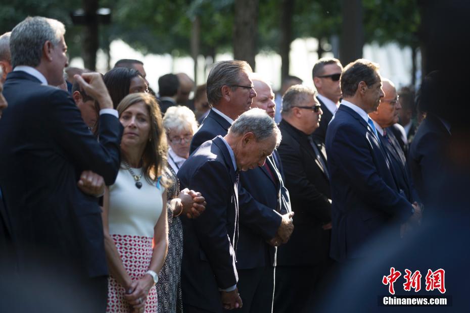 当地时间9月11日,美国“9·11”恐怖袭击事件18周年纪念活动在纽约“9·11”遗址纪念广场举行,纽约市前市长布隆伯格(中)、现任市长白思豪(左)等出席活动。 中新社记者 廖攀 摄