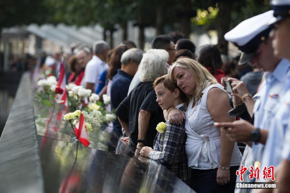 当地时间9月11日,民众在纽约世贸遗址前寄哀思。当日,美国“9·11”恐怖袭击事件18周年纪念活动在纽约“9·11”遗址纪念广场举行。 中新社记者 廖攀 摄