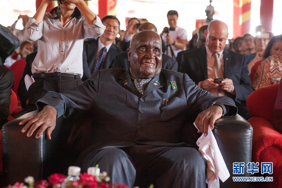 2017年1月14日,在赞比亚卢萨卡的中国春节庙会演出现场,卡翁达观看文艺演出。 新华社记者 彭立军 摄