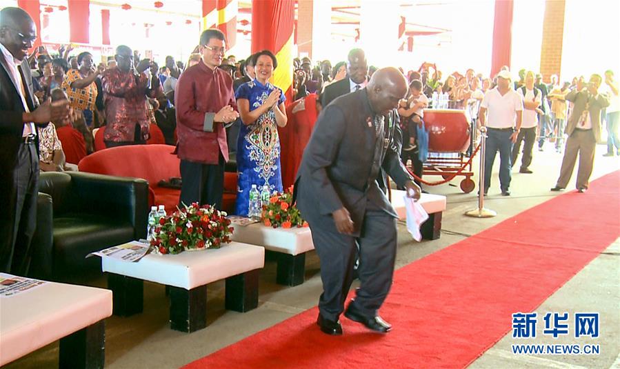 2017年1月14日,赞比亚卢萨卡,卡翁达在中国庙会现场即兴跳舞。 新华社记者 彭立军 摄