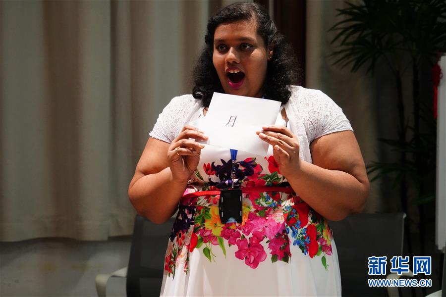 9月11日,在斯里兰卡科伦坡港口城项目部的中文培训班中秋特别课堂上,一位学员在猜字谜游戏中开心地找到“月”。新华社记者 唐璐 摄