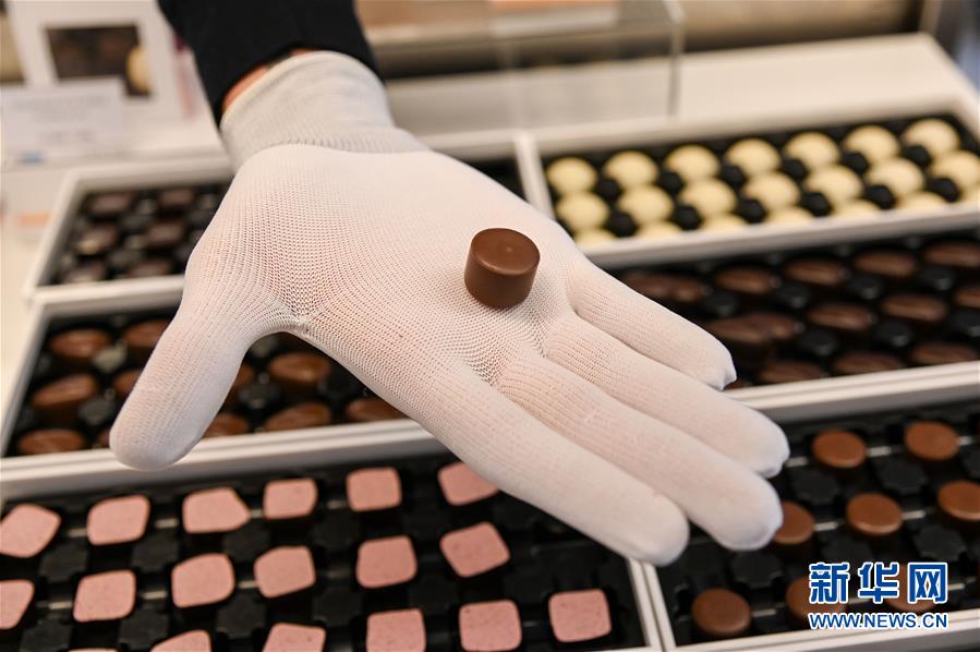 9月5日,一名店员在比利时布鲁塞尔一家商店展示巧克力甜品。新华社发(里卡多·帕雷贾尼摄)