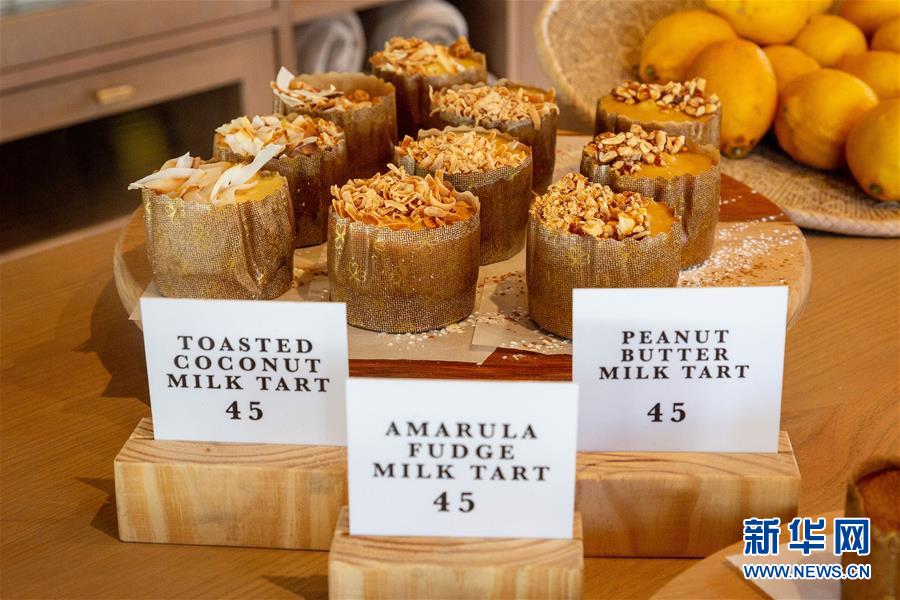 9月10日,在南非约翰内斯堡,一家甜品店的橱窗里展示着不同口味的牛奶蛋挞。牛奶蛋挞是南非“糕点界”中的明星甜品。其外皮由牛奶、黄油、糖等材料混合制成,馅料则使用卡仕达酱。最后,将肉桂粉撒在成型的蛋挞上便可端上餐桌。新华社发(耶希尔摄)