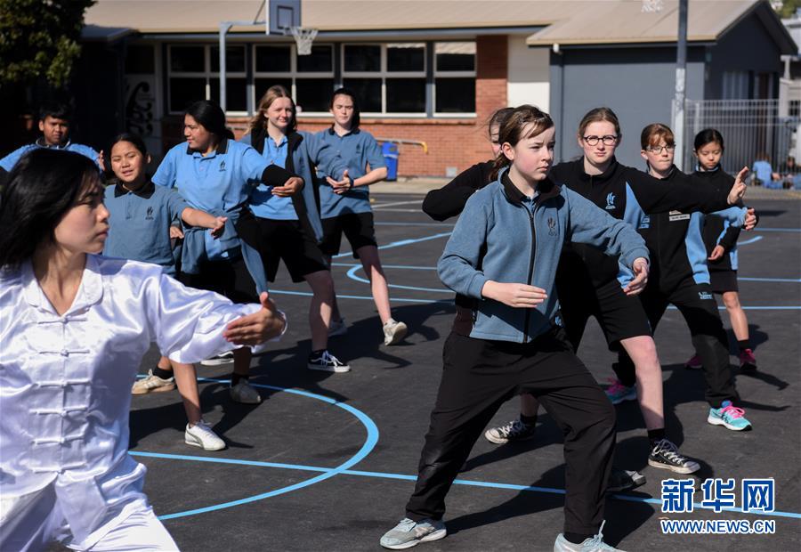 9月12日,在新西兰首都惠灵顿的埃文斯湾初级中学,学生在中国老师带领下学习太极拳。新华社记者郭磊摄
