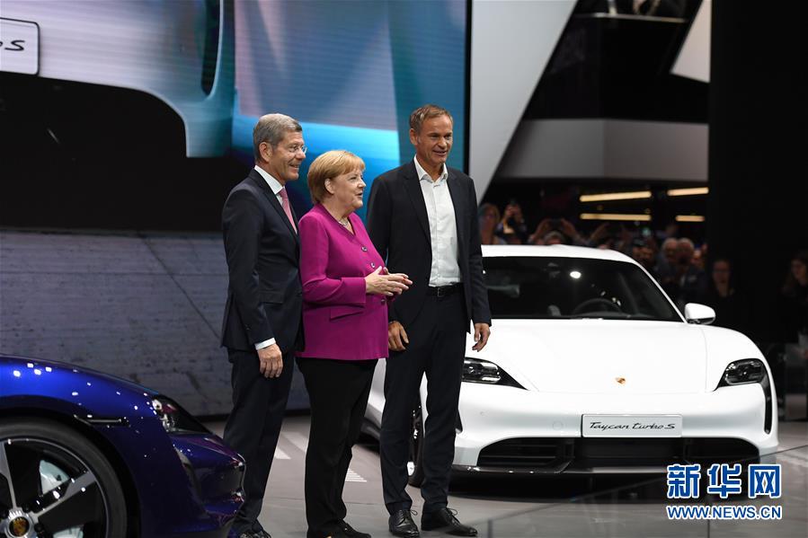 9月12日,在德国法兰克福,德国总理默克尔(中)在2019年法兰克福国际车展开幕式上与保时捷首席执行官奥利弗·布卢姆(右)、德国汽车工业联合会主席伯恩哈德·马特斯合影。 新华社记者逯阳摄