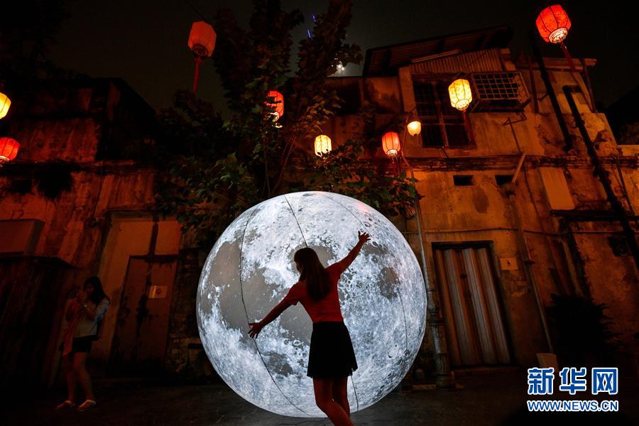 9月13日,在马来西亚吉隆坡,市民在月亮模型气球前拍照留念。新华社发 (张纹综摄)