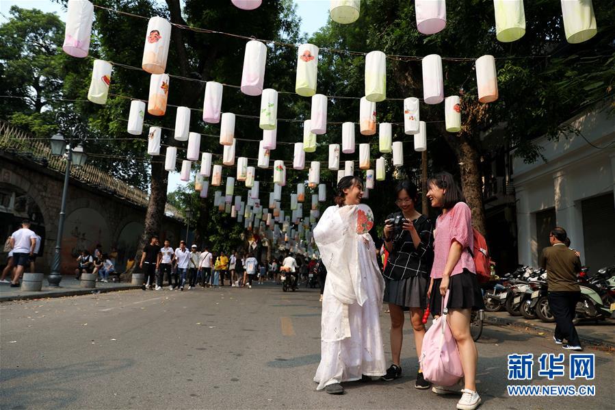 9月13日,在越南首都河内,人们在挂满灯笼的街上谈笑。新华社记者 王迪 摄