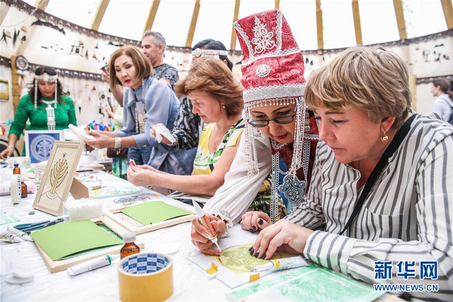 9月13日,在俄罗斯首都莫斯科扎里亚杰公园,游客在雅库特地区展位参与手工艺品制作。新华社发(马克西姆摄)