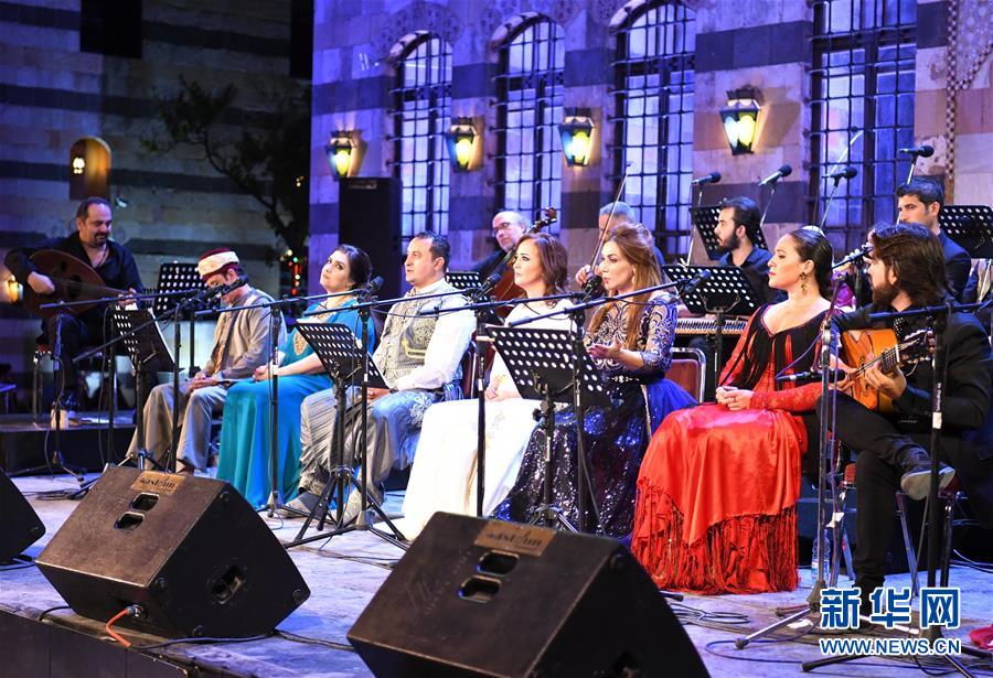 9月13日,在叙利亚首都大马士革一个宫殿遗址举行的民俗音乐会上,一支乐队在表演。新华社发(阿马尔·萨法尔贾拉尼摄)