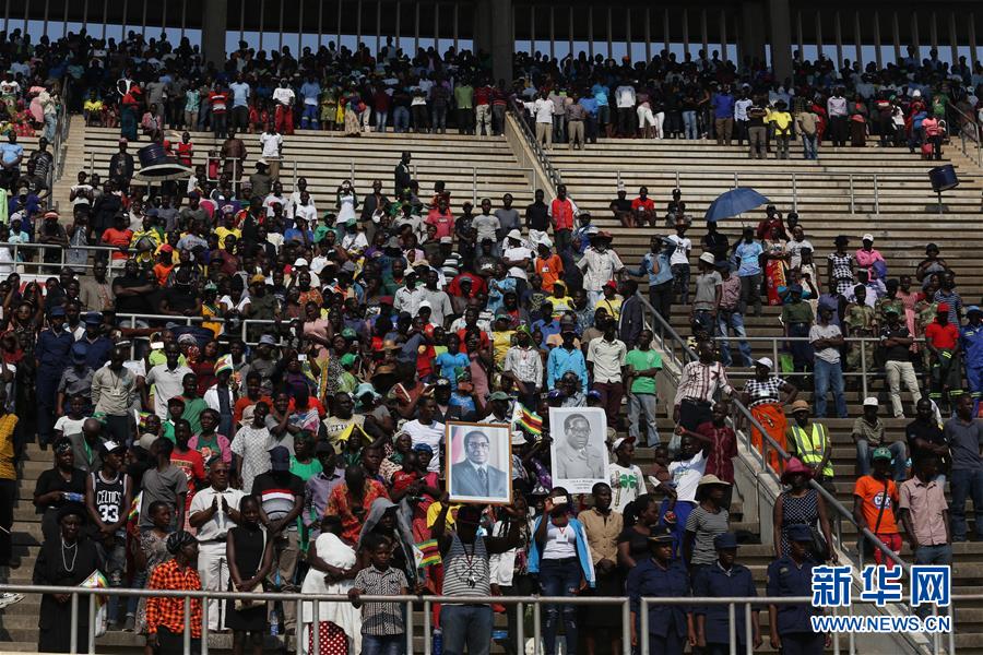 9月14日,在津巴布韦首都哈拉雷的国家体育场,民众手举穆加贝的画像出席他的葬礼。新华社发(陈雅琴摄)
