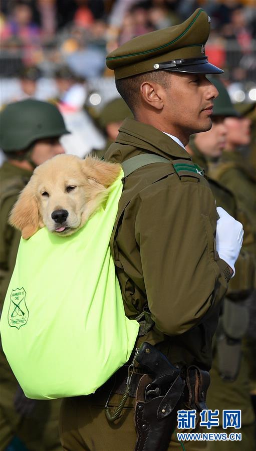 9月19日,在智利首都圣地亚哥,宪兵身背警犬幼犬在阅兵式上行进。 9月19日,一年一度的智利陆军节阅兵式在首都圣地亚哥奥希金斯公园举行。智利陆海空三军和警察部队7600多人参加了阅兵式。 新华社发(豪尔赫·比列加斯 摄)