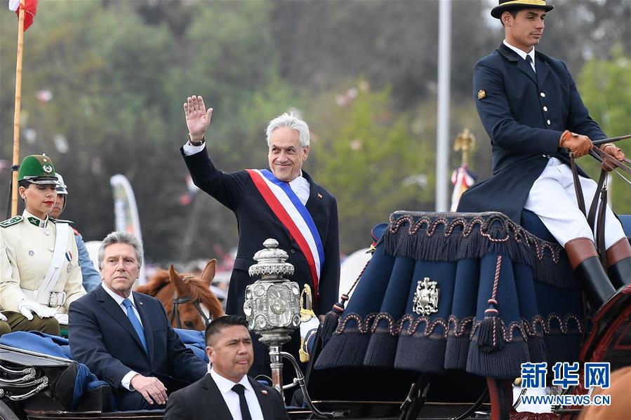 9月19日,在智利首都圣地亚哥,智利总统皮涅拉(中)出席阅兵式。 9月19日,一年一度的智利陆军节阅兵式在首都圣地亚哥奥希金斯公园举行。智利陆海空三军和警察部队7600多人参加了阅兵式。 新华社发(豪尔赫·比列加斯 摄)