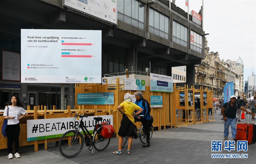 9月22日,在比利时布鲁塞尔,人们在空气质量实时播报平台前驻足观看。 新华社记者潘革平摄