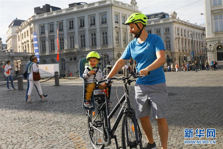 9月22日,在比利时布鲁塞尔,一对父子在“无车日”绿色出行。 新华社记者潘革平摄