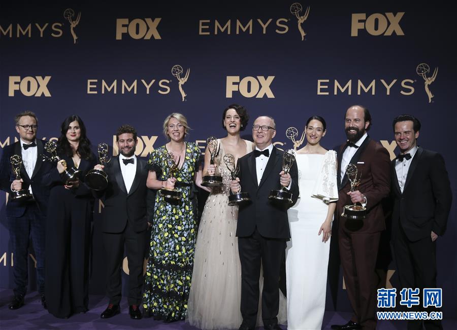 9月22日,在美国洛杉矶,《伦敦生活》主创人员展示奖杯。亚马逊的剧集《伦敦生活》获得艾美奖喜剧类最佳剧集奖。 当日,第71届美国“黄金时段艾美奖”在美国洛杉矶微软剧院举行颁奖礼。 新华社记者李颖摄