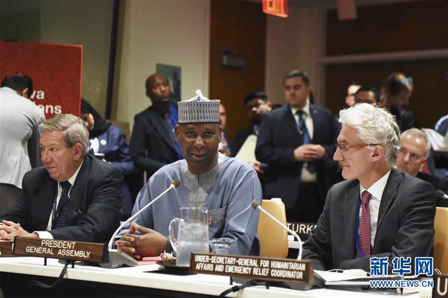 9月23日,在位于纽约的联合国总部,第74届联合国大会主席穆罕默德-班迪(中)在纪念活动上讲话。 当日,联合国总部举行活动,纪念《日内瓦公约》签署70周年。 新华社记者 韩芳 摄