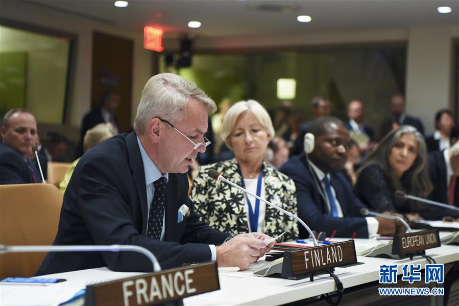 9月23日,在位于纽约的联合国总部,芬兰外长哈维斯托(左)在纪念活动上讲话。 当日,联合国总部举行活动,纪念《日内瓦公约》签署70周年。 新华社记者 韩芳 摄