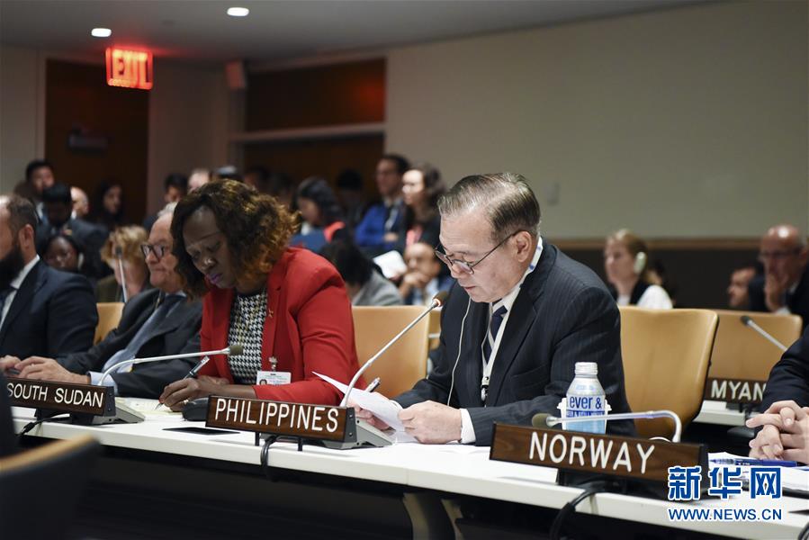 9月23日,在位于纽约的联合国总部,菲律宾外长洛钦(右)在纪念活动上讲话。 当日,联合国总部举行活动,纪念《日内瓦公约》签署70周年。 新华社记者 韩芳 摄