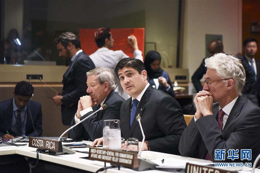 9月23日,在位于纽约的联合国总部,哥斯达黎加总统卡洛斯·阿尔瓦拉多(中)在纪念活动上讲话。 当日,联合国总部举行活动,纪念《日内瓦公约》签署70周年。 新华社记者 韩芳 摄