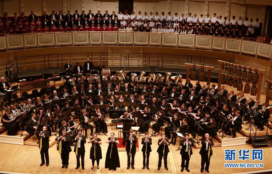 9月22日,在美国芝加哥,瓦尔普莱索大学合唱团和交响乐团在音乐会上表演。 第三届“友谊地久天长”中美音乐会22日在芝加哥交响乐中心音乐大厅举行。 新华社记者 汪平 摄