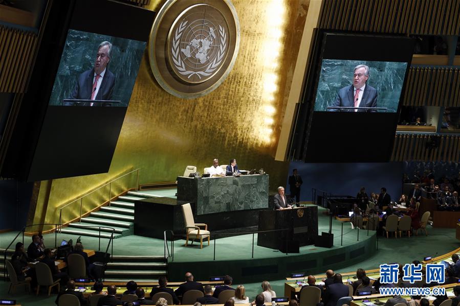 9月24日,在位于纽约的联合国总部,联合国秘书长古特雷斯发表开幕讲话。新华社记者李木子摄