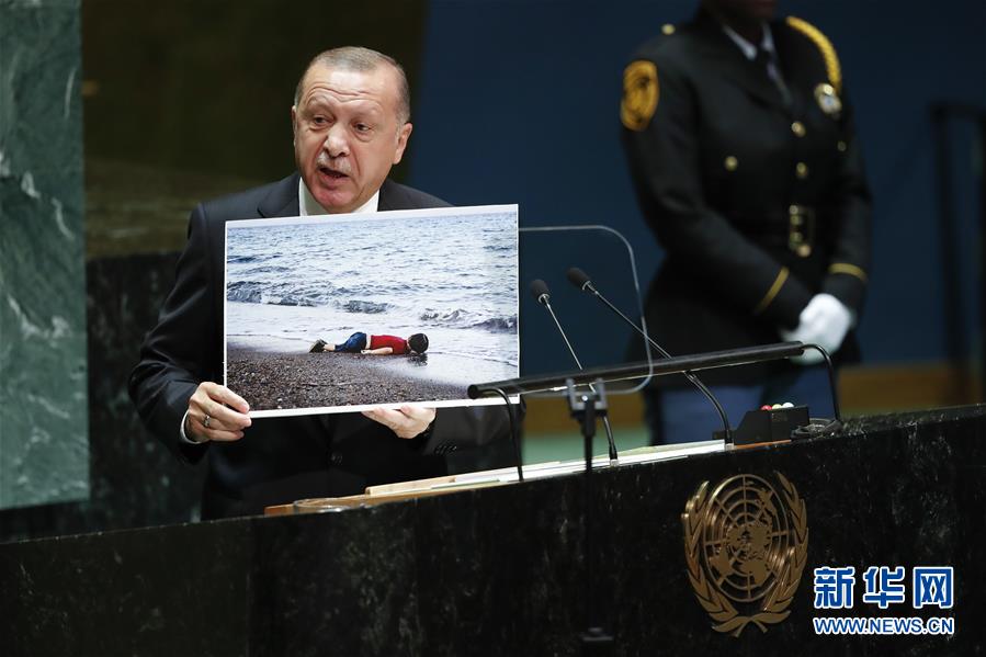 9月24日,在位于纽约的联合国总部,土耳其总统埃尔多安在第74届联合国大会一般性辩论上发言。 新华社记者李木子摄