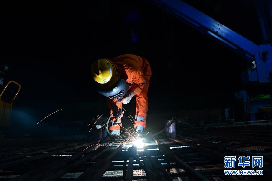 9月24日,在印尼雅万高铁DK1353桥22-25号墩,工作人员在首座连续梁合龙前进行电焊作业。 印度尼西亚雅万高铁项目全线首座连续梁24日晚顺利合龙,为后续箱梁架设和铺轨工作奠定基础。 新华社记者 杜宇 摄
