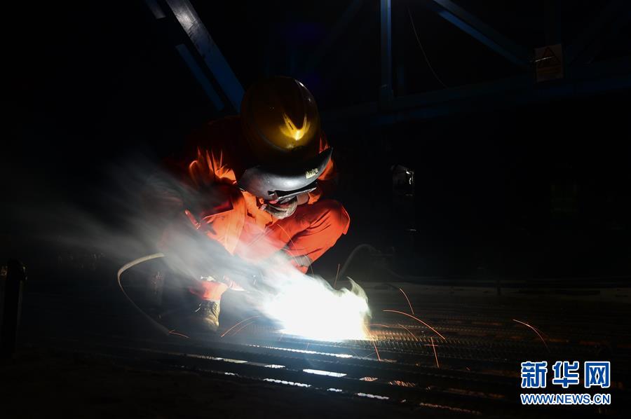 9月24日,在印尼雅万高铁DK1353桥22-25号墩,工作人员在首座连续梁合龙前进行电焊作业。 印度尼西亚雅万高铁项目全线首座连续梁24日晚顺利合龙,为后续箱梁架设和铺轨工作奠定基础。 新华社记者 杜宇 摄
