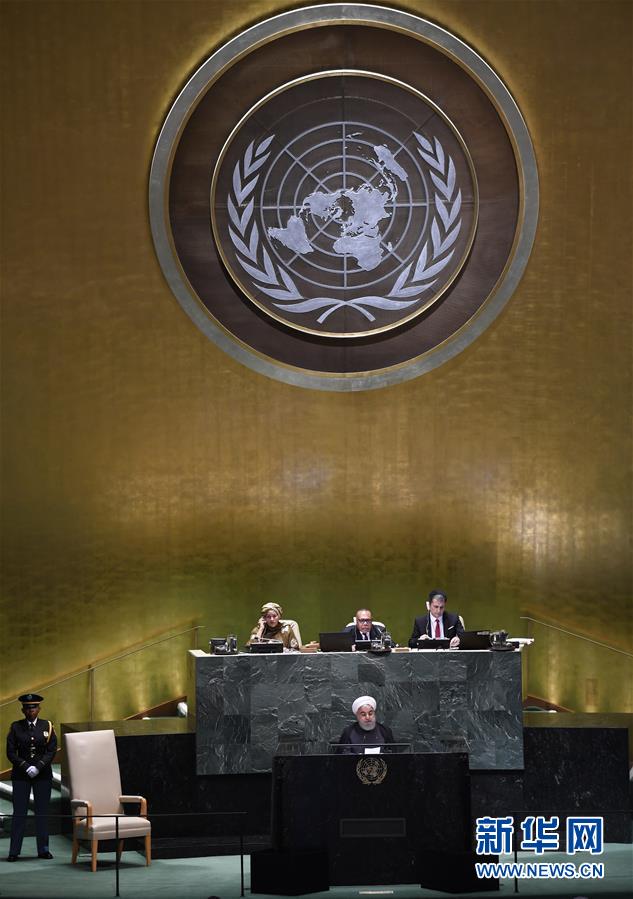 9月25日,在位于纽约的联合国总部,伊朗总统鲁哈尼(前)在第74届联合国大会一般性辩论上发言。 伊朗总统鲁哈尼25日在联合国大会一般性辩论发言时邀请各国加入伊朗主导的霍尔木兹和平计划,以维护地区安全。他重申伊朗拒绝在美国制裁压力下与之谈判。 新华社记者 刘杰 摄