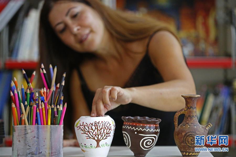 9月25日,在黎巴嫩南部的拉谢亚福哈尔小镇,陶器艺人在一间作坊里展示成品陶器。 新华社发(比拉尔·贾维希摄)