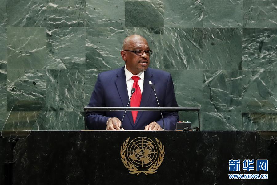 9月27日,在位于纽约的联合国总部,巴哈马总理休伯特·明尼斯在第74届联合国大会一般性辩论上发言。 当日,第74届联合国大会一般性辩论进入第四天。 新华社记者李木子摄