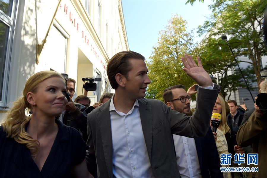 9月29日,奥地利人民党主席库尔茨(前右)在维也纳的一处投票站完成投票后离开。 奥地利国民议会选举29日举行,民调显示前总理库尔茨领导的中右翼人民党支持率大幅领先,库尔茨有望重新执政。 新华社记者 郭晨 摄