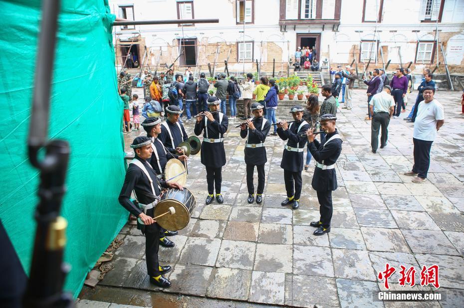 9月29日,身着尼泊尔廓尔喀传统服饰的男子们在加德满都杜巴广上奏乐,迎接德赛节的到来。“德赛节”是尼泊尔最盛大的节日,每年尼历6月(公历9月-10月)举行,全国放假10至15天。节日期间,人们会举行宰牲仪式,祭奉神灵,祈祷幸福长寿。中新社发 普拉丹 摄