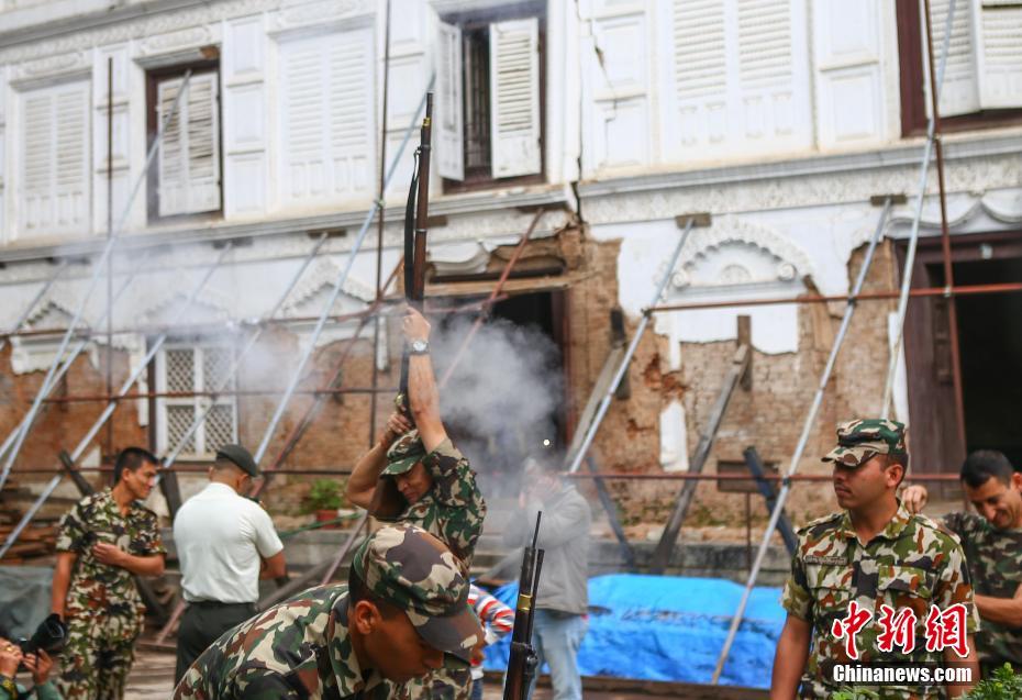 9月29日,几位士兵在尼泊尔加德满都杜巴广场上鸣枪,迎接德赛节的到来。“德赛节”是尼泊尔最盛大的节日,每年尼历6月(公历9月-10月)举行,全国放假10至15天。节日期间,人们会举行宰牲仪式,祭奉神灵,祈祷幸福长寿。中新社发 普拉丹 摄