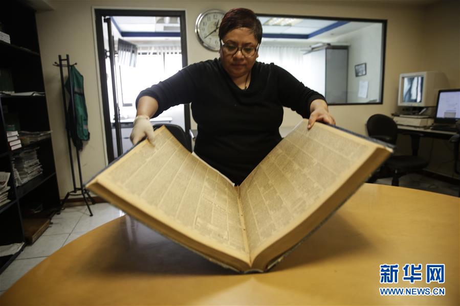 9月9日,在墨西哥首都墨西哥城,《宇宙报》阅览室老员工艾达·卡斯特罗拿出一本装订好的旧报纸。 新华社发(弗朗西斯科·卡涅多摄)