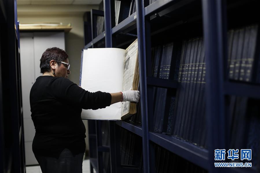 9月9日,在墨西哥首都墨西哥城,《宇宙报》阅览室老员工艾达·卡斯特罗从档案室取出一本装订好的旧报纸。 新华社发(弗朗西斯科·卡涅多摄)