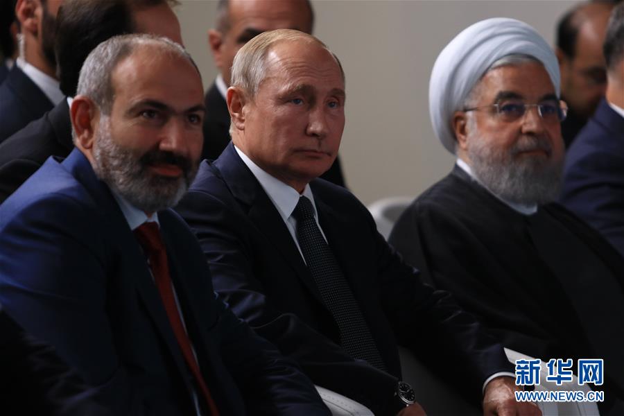 10月1日,在亚美尼亚首都埃里温,俄罗斯总统普京(中)、伊朗总统鲁哈尼(右)和亚美尼亚总理帕希尼扬出席欧亚经济委员会最高理事会会议。 当日,欧亚经济联盟最高权力机构欧亚经济委员会最高理事会会议在亚美尼亚首都埃里温举行,与会方讨论了推动欧亚经济联盟内部建立统一金融市场、调整成员国进口关税、协调成员国在天然气供应和运输等领域立法等议题。 新华社发(格扎拉扬 摄)