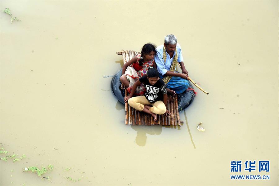 10月2日,在印度比哈尔邦,人们乘坐简易筏在洪水中前行。 印度比哈尔邦灾害管理部门2日说,9月27日至30日发生的洪灾造成该邦至少42人死亡、170多万人受灾。 新华社发