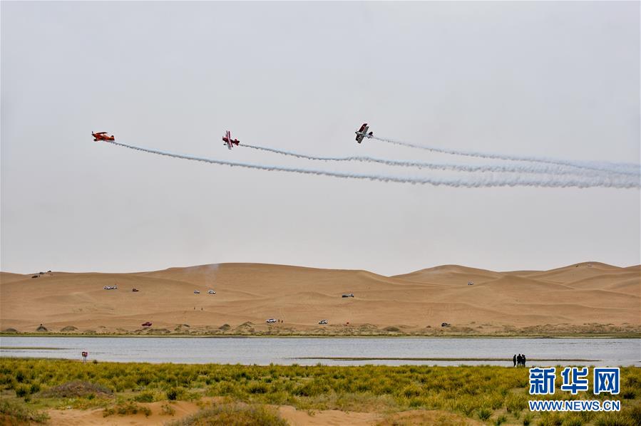 10月3日,来自澳大利亚的飞行表演队编队飞过沙丘。 当日,第14届越野e族阿拉善英雄会上演精彩飞行秀。 越野e族英雄会是一年一度的大型汽车越野主题沙漠文化盛会。2013年,越野e族英雄会落户阿拉善,这是一项集汽车体育、航空文化、音乐盛典、拳击格斗、特色美食等于一体的综合性文化活动。 新华社记者杨光摄