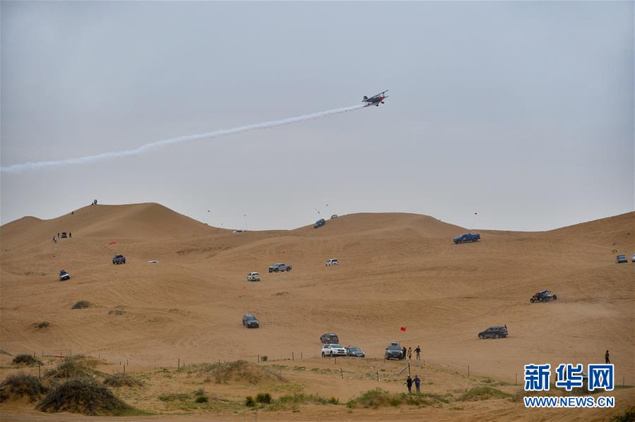 10月3日,来自美国的飞行员斯盖普驾机飞过沙丘。 当日,第14届越野e族阿拉善英雄会上演精彩飞行秀。 越野e族英雄会是一年一度的大型汽车越野主题沙漠文化盛会。2013年,越野e族英雄会落户阿拉善,这是一项集汽车体育、航空文化、音乐盛典、拳击格斗、特色美食等于一体的综合性文化活动。 新华社记者杨光摄