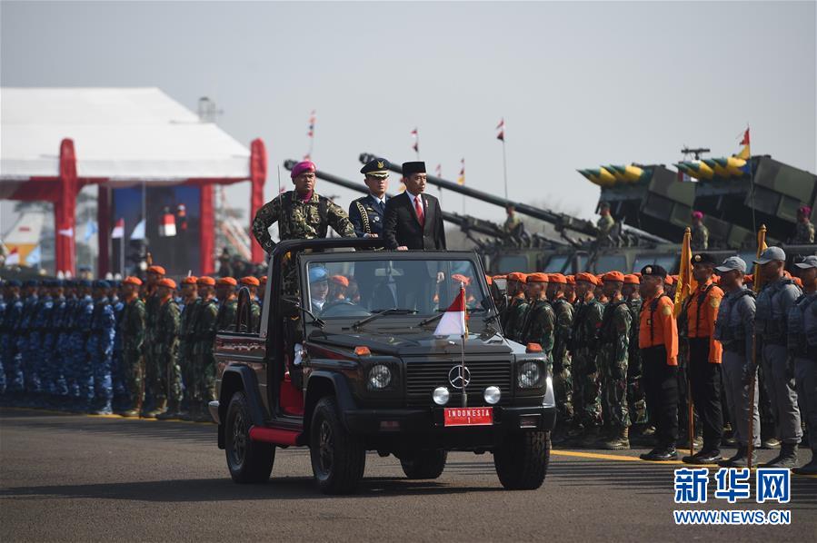 10月5日,在印度尼西亚雅加达,印尼总统佐科(前右)在国民军建军74周年庆祝活动上检阅士兵。 当日是印度尼西亚国民军建军74周年纪念日。 新华社发(祖卡南摄)