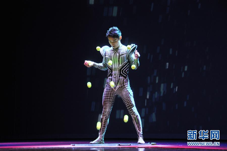 10月4日,在美国休斯敦,中国杂技团演员表演球技。 由中国侨联主办的“亲情中华”文艺演出4日晚在美国第四大城市休斯敦拉开帷幕,杂技、戏曲、民乐等节目让现场逾千名观众连声叫好。 新华社记者 刘立伟 摄