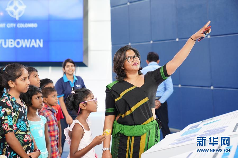 10月5日,在斯里兰卡科伦坡港口城组织的儿童节庆祝活动上,在港口城工作的当地员工因杜尼带领孩子们参观港口城项目部展厅。 新华社记者唐璐摄