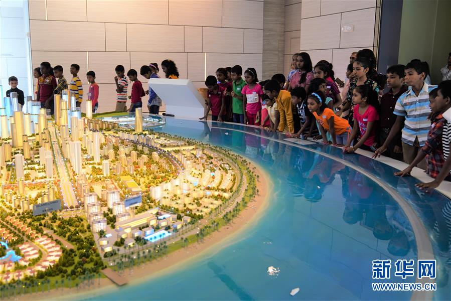 10月5日,在斯里兰卡科伦坡港口城组织的儿童节庆祝活动上,孩子们在港口城项目部展厅参观沙盘模型。 新华社记者唐璐摄