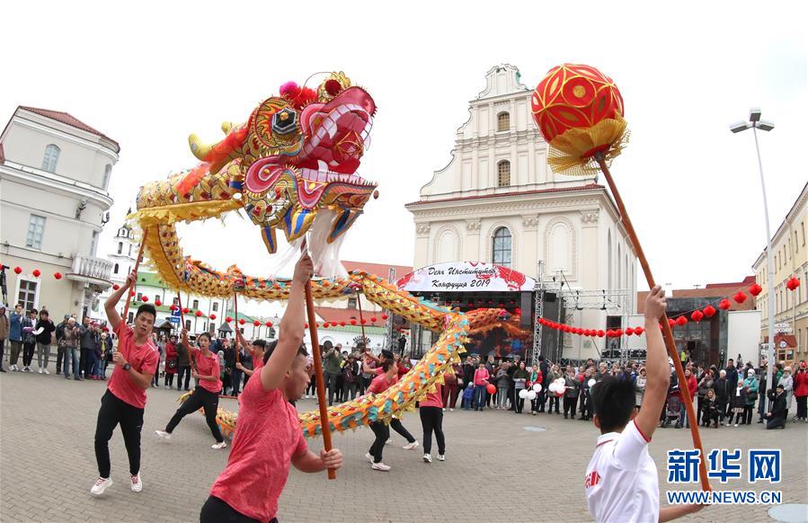 10月5日,在白俄罗斯首都明斯克,人们在“孔子学院日”活动上表演舞龙。 新华社发(任科夫摄)