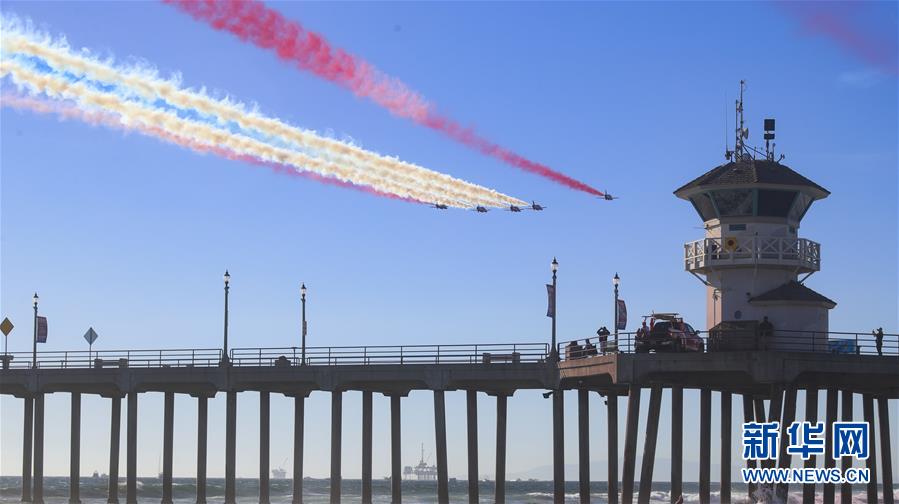 这是10月6日在美国加利福尼亚州亨廷顿海滩拍摄的特技飞行表演。 一年一度的亨廷顿海滩特技飞行表演于10月4日至6日举行。 新华社记者李颖摄