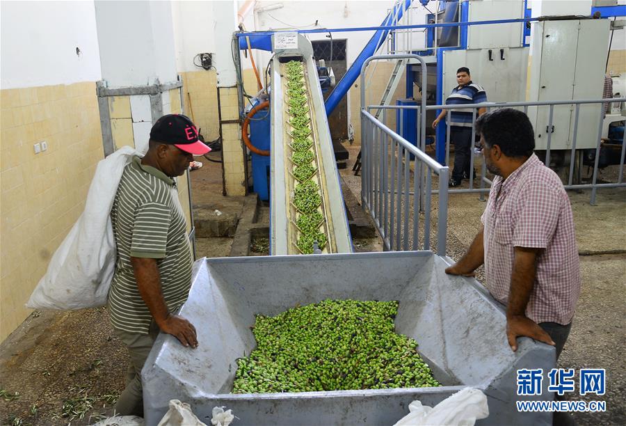 10月7日,在加沙城,巴勒斯坦工人在榨油机器旁工作。 当地每年9月中旬至11月是橄榄的丰收季。 新华社发(里泽克摄)