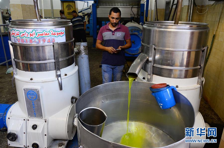10月7日,在加沙城,橄榄油从榨油机器中流出。 当地每年9月中旬至11月是橄榄的丰收季。 新华社发(里泽克摄)