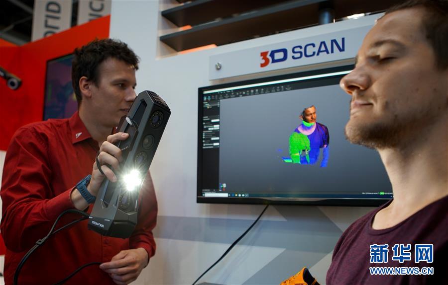 10月7日,观众在博览会上体验3D扫描。10月7日,第61届布尔诺国际机械博览会在捷克城市布尔诺开幕。新华社发(达娜·科什奈洛娃摄)