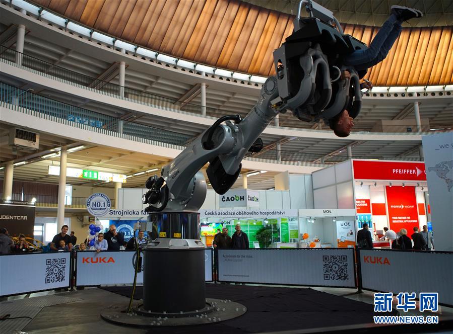 10月7日,观众在博览会上体验KUKA公司展出的自动机械臂。10月7日,第61届布尔诺国际机械博览会在捷克城市布尔诺开幕。新华社发(达娜·科什奈洛娃摄)